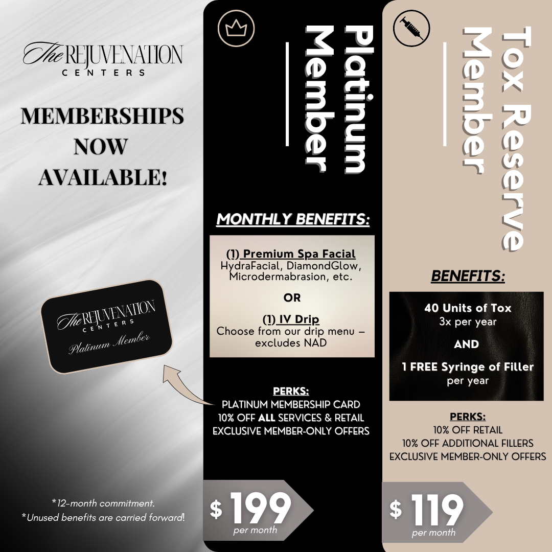 Discover exclusive access to premium aesthetic and wellness treatments with our new membership plans at The Rejuvenation Centers. Whether you’re seeking radiant skin, rejuvenating IV therapies, or a consistent touch-up with injectables, our Platinum and Tox Reserve memberships are designed to provide exceptional value and unparalleled benefits. Commit to your glow, and let us take care of the rest!